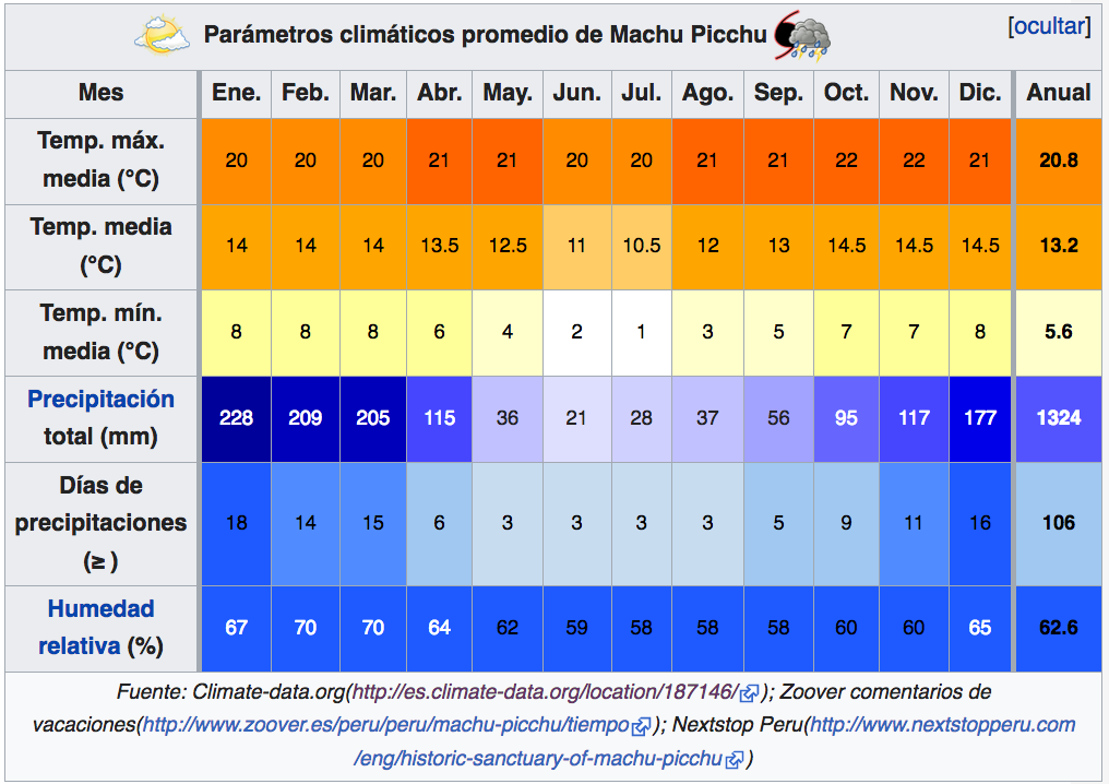 Machu Picchu se ubica entre la Cordillera de los Andes y la selva amazónica, teniendo un clima cálido y templado. En la ciudadela nunca pasarás ni mucho frío ni mucho calor, con una temperatura mínima promedio de 12 °C y una temperatura máxima promedio de 24 °C. Como se trata de una zona subtropical, todos los días del año hay posibilidad de lluvias, sin embargo, de abril a septiembre es la época seca y de octubre a marzo es la época de lluvias. Por lo general, las épocas secas son las preferidas A continuación agrupamos 5 períodos del año con sus estadísticas propias relacionadas a la cantidad de lluvia, temperatura y cantidad de turistas (este último basado en datos 2016 obtenidos del INEI).